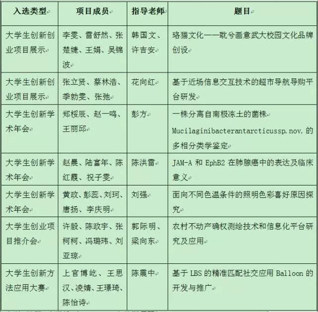 本届年会参与高校和参展规模空前,根据规定推荐配额,全国共推荐项目1066项。经层层评审,236所高校403项项目入选年会。我校共有7个项目入选年会,覆盖年会所有参赛类别,其中学术论文3篇、创新创业展示项目2项、创业推介项目1项、创新方法应用大赛学生组1项。我校项目获得评委一致好评,最终李雯团队及张立贤团队获评“我最喜爱项目”奖项。 本届年会的主题是“砥砺十年·星火燎原”,评选出优秀论文21篇、我最喜爱的项目20项、最佳创意项目20项、优秀创业项目6项、创新方法应用优秀学生团队10名、创新方法应用优秀指导教师10名。 据悉,2007年至今,“国创计划”已实施十年,30余万拥有创新创业梦想的大学生在创新创业的平台上展露锋芒,已成为强化创新创业实践的重要载体,成为高等教育的一项品牌活动。今后我校将以党的十九大精神为指引,以“国创计划”等工作为重要抓手,持续深化高校创新创业教育改革,提高大学生的创新创业能力,为实施创新驱动发展战略提供人才支撑。 >>>入选大学生创新创业年会团队名单